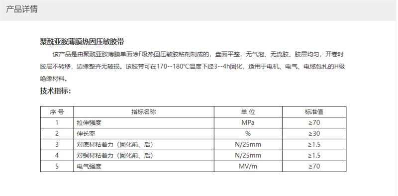 该产品是由聚酰亚胺薄膜单面涂F级热固压敏胶粘剂制成的,盘面平整,无气泡、无流胶、胶层均匀,开卷时胶层不转移,边缘整齐无破损。