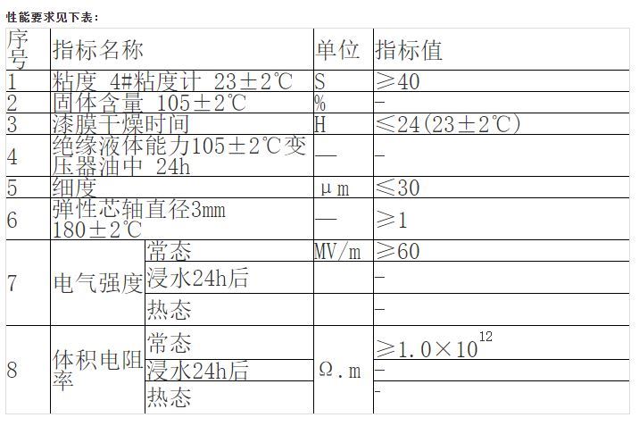 热等级H级。漆膜坚硬、干燥快、粘合力好、电性能优良。适用于电炉线圈,铜管,牵引电机的线圈涂覆及热绝缘零部件的涂覆。